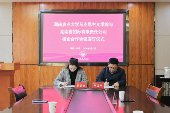 为进一步深化校企合作、推进协同发展,1月12日下午,湖南省招标有限责任公司与湖南农业大学马克思主义学院签定校企合作协议。